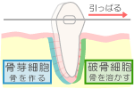 歯は歯根膜(しこんまく)という繊維でできた膜に守られ、アゴの骨に固定されています。矯正装置で歯に弱い力を加え続けると、引っぱった側の歯根膜は縮み、反対側の歯根膜は伸びます。伸びた側は骨芽細胞(こつがさいぼう)によって新しく骨を作り、縮んだ側は破骨細胞(はこつさいぼう)によってアゴの骨を溶かし、力が加えられた方向へと歯が移動します。矯正治療によって歯が動くスピードは1ヶ月に0.8〜1ミリが適切とされていますので、これを少しずつ繰り返しながら歯を動かします。